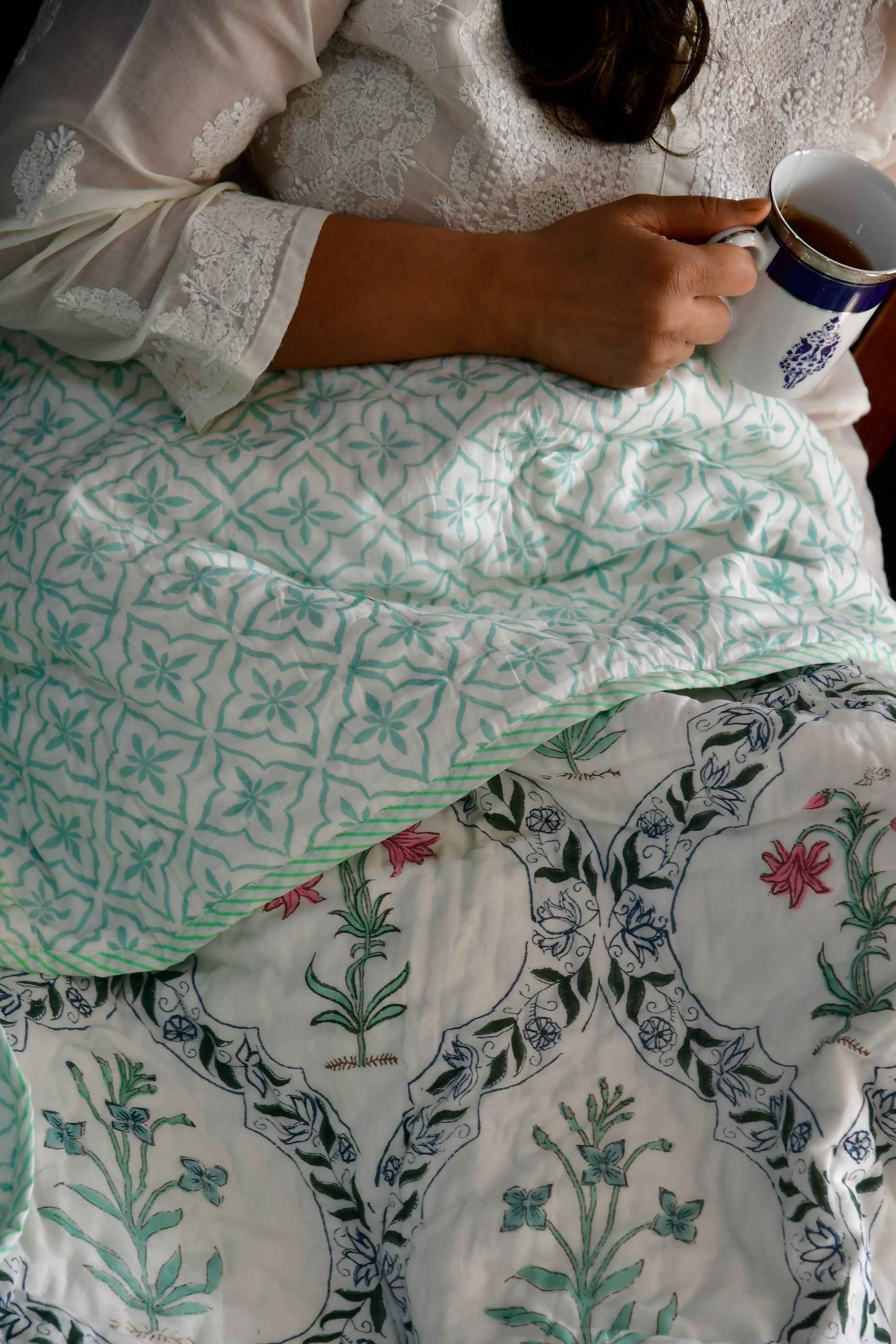 Hand Block Printed Cotton Quilt – Sea Green Floral Jaal Design – Single & Double Bed