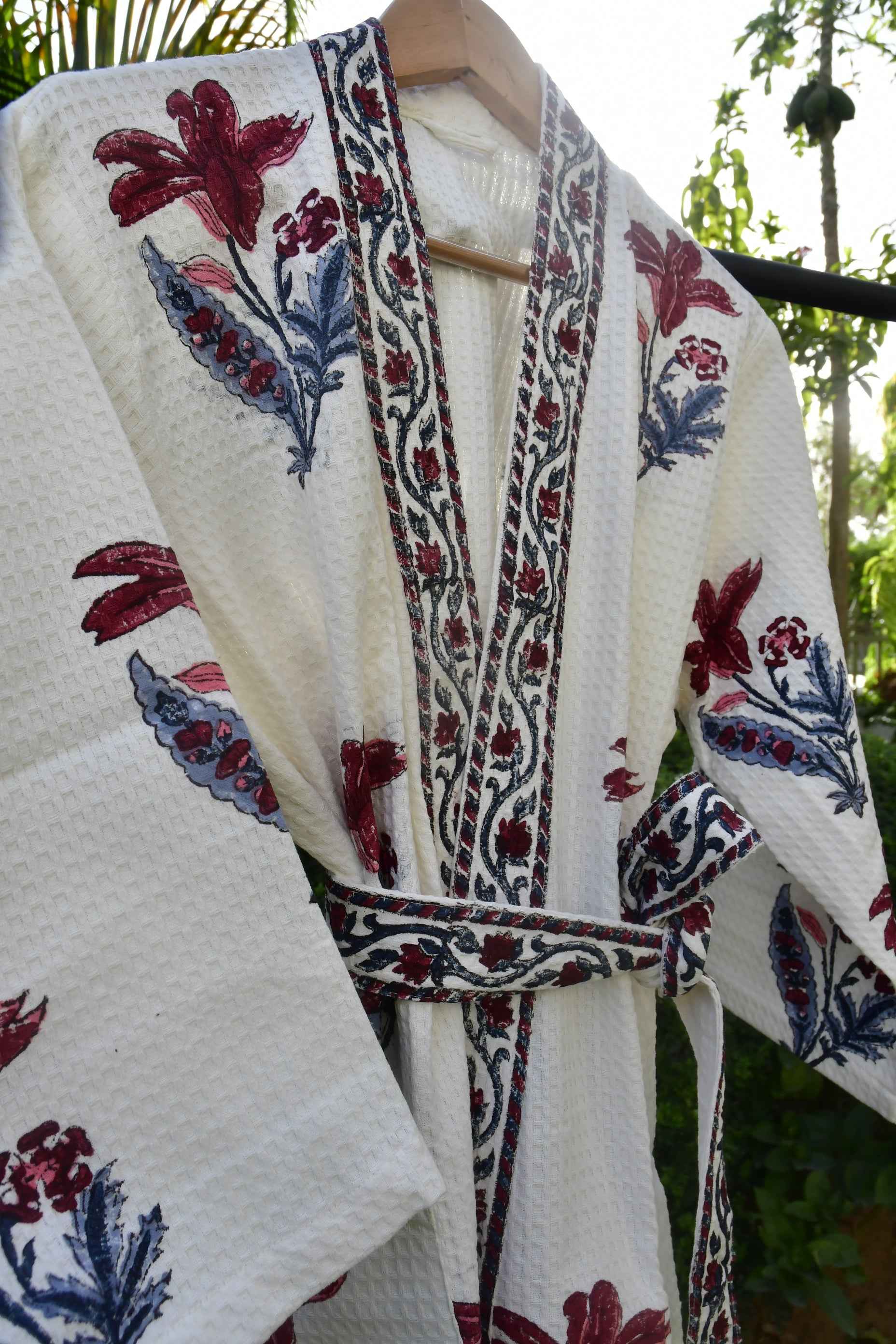 Discover spa-like luxury with our Peace Lily waffle cotton bathrobe. This premium bathrobe features serene hand-block printed peace lily motifs on ultra-absorbent waffle cotton fabric.
