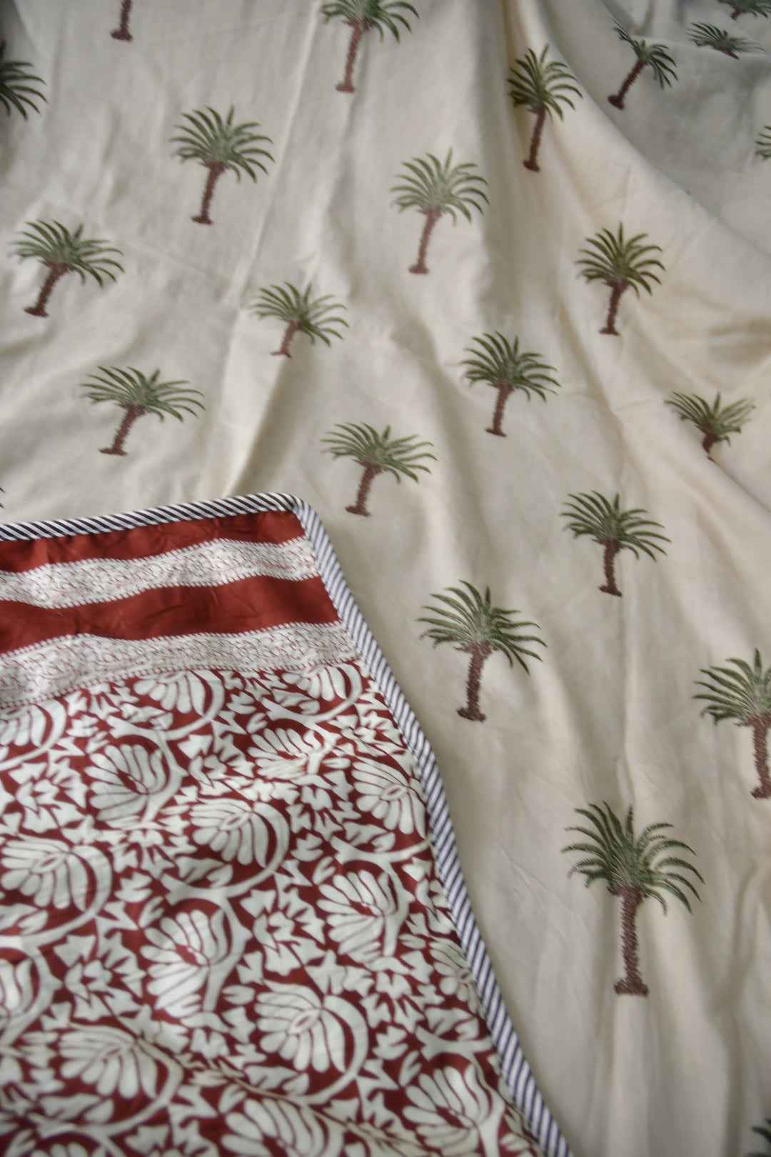 Each dohar showcases the timeless art of Jaipuri hand block printing, where skilled artisans use traditional wooden blocks to create intricate palm and floral jaal (lattice) patterns. The rich maroon on beige palette brings warmth, sophistication, and traditional elegance to any bedroom while celebrating Rajasthan's rich textile heritage.